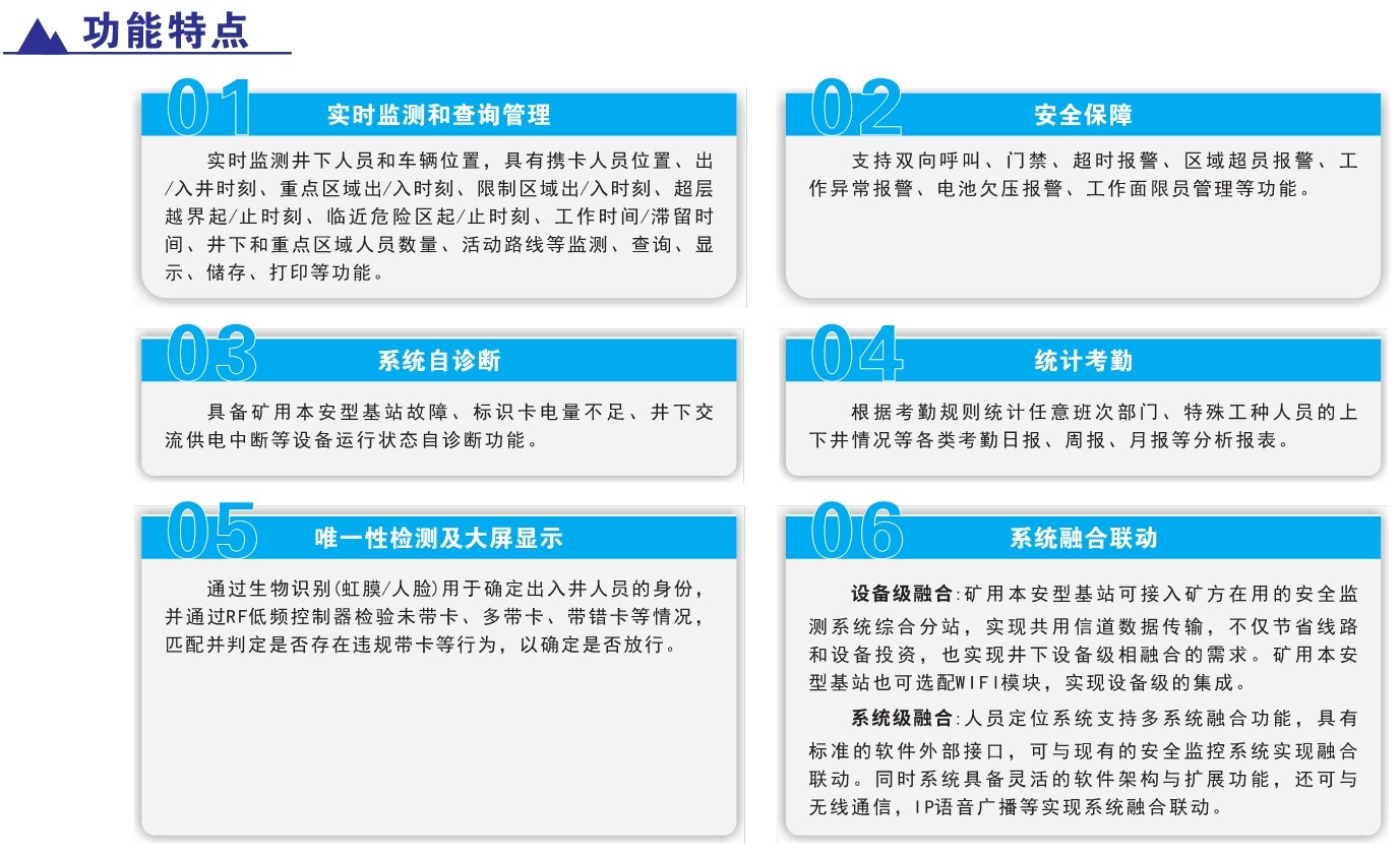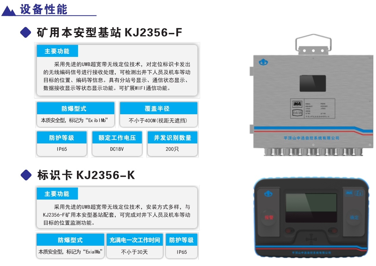 產品簡介:KJ2356J煤礦井下人員精確定位系統(tǒng),采用超寬帶無線(UWB)、慣性測量單元(IMU)、到達時差法(TODA)等多源融合定位方法,實現(xiàn)井下移動目標定位精度小于0.3米的井下類GPS系統(tǒng)。該系統(tǒng)不僅強化了人員位置的精準感知,實現(xiàn)煤礦井下作業(yè)人員位置的監(jiān)測管理、報警、各類數(shù)據(jù)查詢及報表功能。同時支持與車輛定位融合,將精準定位技術應用到井下機車、采掘裝備等各類設備。該系統(tǒng)具有定位精度高、抗干擾能力強,系統(tǒng)容量大、安裝使用簡便等特點,對煤礦高效生產和應急教援具有十分重要的意義。該系統(tǒng)不僅強化了人員位置的精準感知,實現(xiàn)煤礦并下作業(yè)人員位置的監(jiān)測管理、報警、各類數(shù)據(jù)查詢及報表功能。同時支持與車輛定位融合,將精準定位技術應用到井下機車、采掘裝備等各類設備。