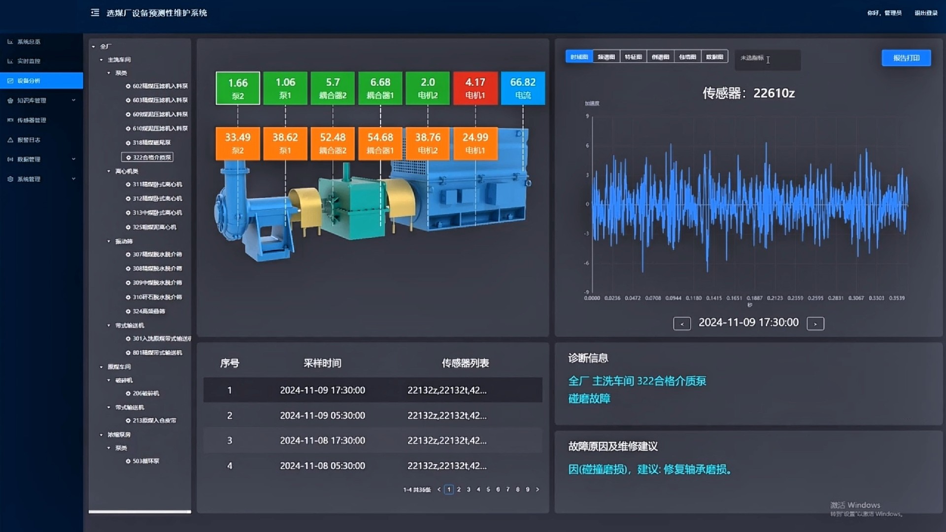 產(chǎn)品簡介:選煤廠設(shè)備預(yù)測(cè)性維護(hù)系統(tǒng)實(shí)時(shí)采集選煤廠生產(chǎn)設(shè)備的多維數(shù)據(jù)(溫振數(shù)據(jù)、電氣數(shù)據(jù)、設(shè)備實(shí)時(shí)數(shù)據(jù)、設(shè)備管理數(shù)據(jù)、音視頻數(shù)據(jù)),利用先進(jìn)數(shù)字信號(hào)處理算法、人工智能算法、專家知識(shí)庫等方法對(duì)設(shè)備進(jìn)行實(shí)時(shí)監(jiān)測(cè)、故障分析和故障溯源。在設(shè)備出現(xiàn)異常時(shí),能夠分析出異常原因,給出合理維修建議,生成維修報(bào)告并白動(dòng)推送給檢修人員,指導(dǎo)檢修人員進(jìn)行設(shè)備維護(hù),實(shí)現(xiàn)流程化閉環(huán)管理。選煤廠設(shè)備預(yù)測(cè)性維護(hù)系統(tǒng)可早期發(fā)現(xiàn)設(shè)備異常,實(shí)現(xiàn)由“事后維修”向“預(yù)知檢修”的轉(zhuǎn)變,從而實(shí)現(xiàn)設(shè)備維護(hù)安全損失最小、總維護(hù)成本最低、總維修時(shí)間最少。